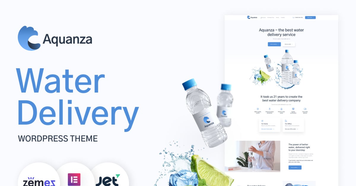 Water Delivery WordPress Theme – AquanzaAquanza WordPress Theme is a modern and efficient solution for building a professional website for water delivery services. This water delivery WordPress theme is идеально suited for businesses that want to attract more customers, streamline orders, and present their services in a clean and engaging way.Whether you serve offices or private customers, Aquanza helps you create a strong online presence and promote your delivery services effectively.Bottled Water Theme – Functional & Conversion-FocusedThis bottled water theme is designed to simplify the process of launching a website. With ready-made layouts and intuitive structure, you can quickly create a landing page, business site, or online store.Key features include:Pre-designed pages (Home, About, Shipping & Prices, Blog, Contacts, Order)Catalog for showcasing products and servicesBuilt-in order forms for fast customer requestsMarketing blocks and call-to-action buttonsSocial media integration and SEO-friendly structureThe design uses fresh blue and white tones to create a sense of purity and trust, helping your brand stand out.Beverage Distribution Website – Responsive & ScalableAquanza is fully responsive, ensuring your beverage distribution website works flawlessly on all devices. The mobile version emphasizes quick ordering, making it easy for users to submit requests directly from their smartphones.The theme is flexible and scalable, allowing you to expand your website from a simple landing page to a large platform for managing orders, showcasing products, and sharing updates through a blog.Versatile Uses for Delivery & Beverage BusinessesThis theme is ideal for water delivery companies, bottled water suppliers, mineral water distributors, aqua markets, drink online stores, and filter sales businesses. It can also be used for delivery services, water filtration systems, and other beverage-related projects, making it a versatile solution for various industries.Easy Customization & Business GrowthAquanza is easy to install and manage, allowing you to fully control your website without coding knowledge. Customize layouts, colors, and content to match your brand and business goals.With built-in SEO optimization and marketing tools, this water delivery WordPress theme helps improve visibility, attract customers, and increase online orders.Ready-to-Use Solution with SupportLaunch your website in just a few hours with this ready-made template. Aquanza provides all the essential tools for promoting your delivery service and managing customer interactions.If you need assistance, a professional support team is available to help you make the most of your bottled water theme. Changelog Aquanza (June 8, 2021): Cherry Plugins removed; Minor bugs fixed; Elementor Page Builder 3.2 compatible; WordPress 5.7 compatible.